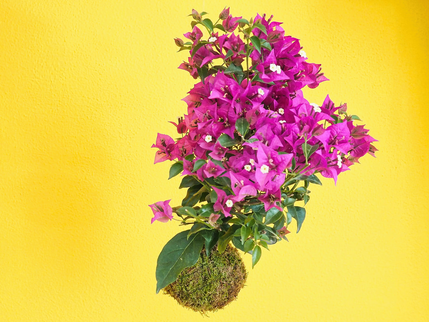 The Bougainvillea Bonsai kokedama is a plant with broad leaves and a lush flowering that persists throughout the summer season.