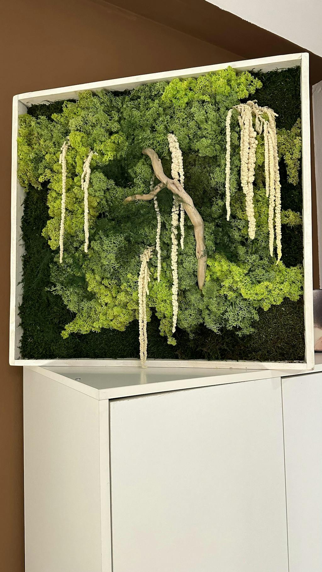 Questo quadro vegetale preservato è composto da muschio naturale, muschio Finlandese, fiori essiccati e colorati di Gipsofila e legno.